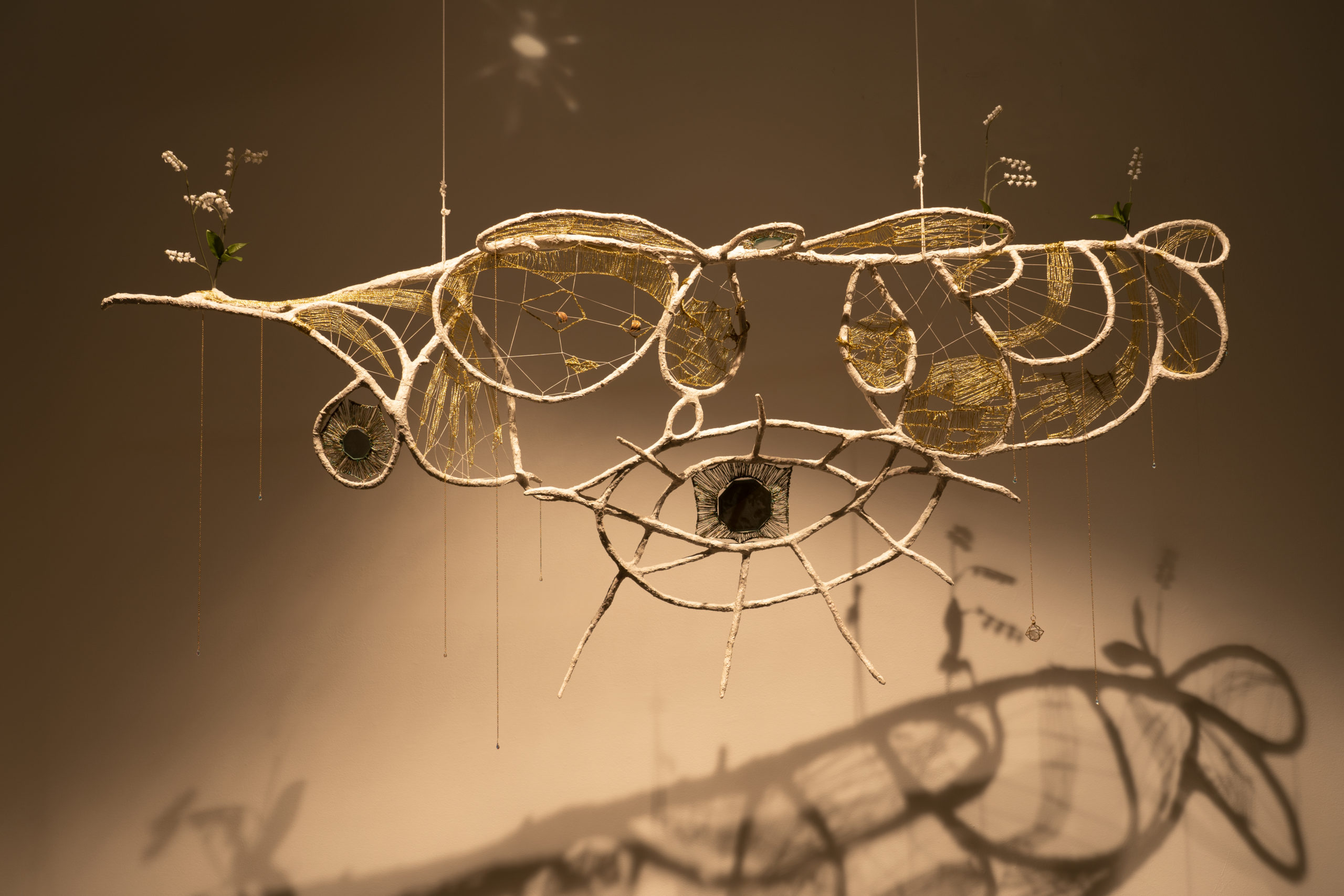 Reeds, branches, wire, resin, mirror, crystals, lamé cord, linen cord, rope, plastic flowers, earrings 85 x 35 x 18 in.